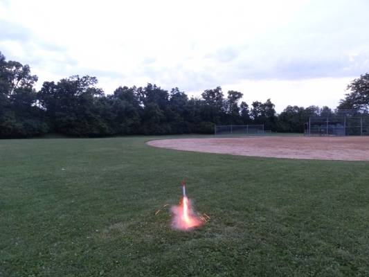 Almost dark at this point, but my audience came down to see my setup and wanted to push the button. Great flame for this flight. Almost treed it, but the breeze dropped it just between two trees.