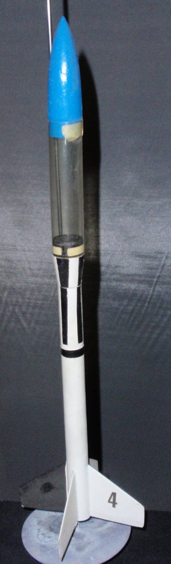 This was before I restored it. New 'chute, new shock cord made from Kevlar, and a new clear payload tube from the Estes Magician...which happens to be the exact same size diameter and length.