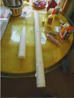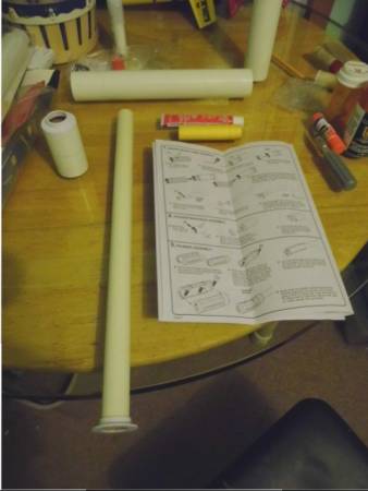 Fin body was test fitted and then plastic glue applied as per instructions. Tube assembly was laid in place and other half of fin body attached and taped together then set aside to dry. In the mean time I grabbed the lower tube and marked the tube for the launch lugs. Once the fin body was set I applied plastic glue it and twisted it into place. I then flipped the tube around and using both carpenter's and plastic glue I glued the Stuffer Bulkhead assembly into body tube. Next step was to glue the launch lugs on again using plastic glue. After they were glued on I glued on the Scale Launch Lug Detail. Rocket was then set aside to dry.