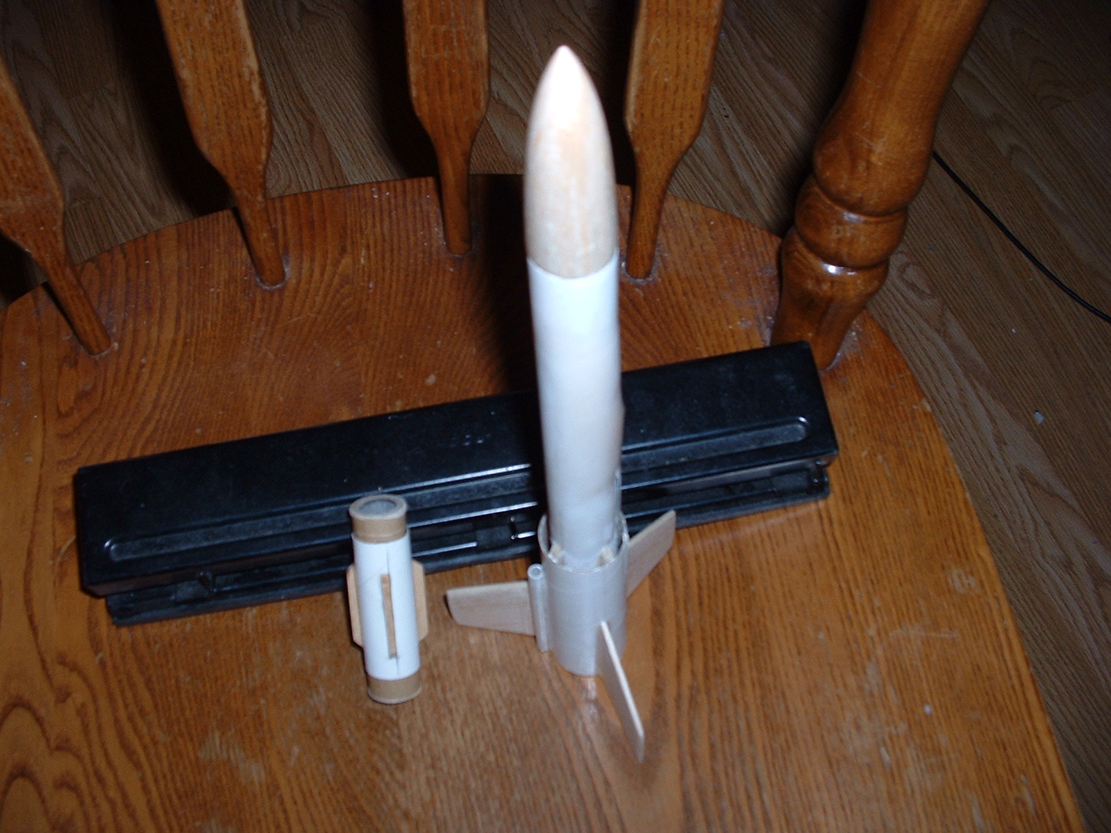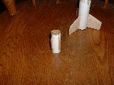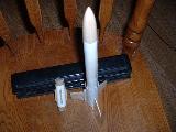 This was not a production kit but rather a free plan provided by Estes Industries. The rocket featured a 1" tube that surrounded the lower half of the airframe and aft end in an attempt to provide thrust augmentation. The booster stage of this two-stage rocket wasd the augmenter tube, which was permanently attached to the sustainer. After staging, the booster motor was ejected out of lower tube, which then became the thrust augmenter for the sustainer. This boosted design was created in an attempt to get the rocket up to sufficient speed with the booster motor so that thrust augmentation could be attempted when the sustainer motor was firing. The designer referred to the Lil' Augie as "an experiment."