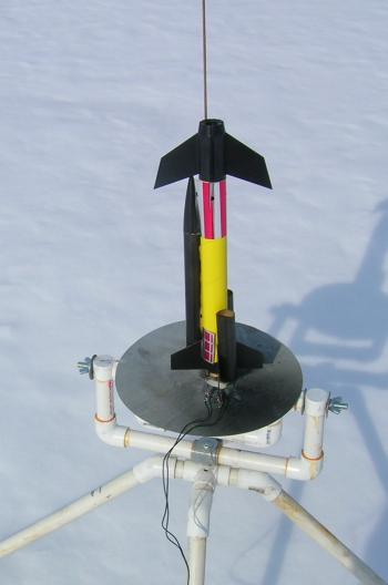 Has 8 fins, motor mount; Kevlar® and elastic shock cord hooked to the motor mount. No nose cone "per se". Very unique looking with the central opening all the way thru. (kind of like "ram air.")