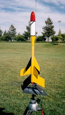 I didn't end up with an exact match, but I liked my compromise: Yellow overall, with a black fin on each stage, a red nose cone, and a white payload section with black trim tape. I purchased a recreation decal from JimZ. I like to give my recreated kits "catalog perfect" finishes. Because the Farside has so many fins this means a LOT of filling and sanding. In fact, there was so much finishing work involved that after I applied its first primer coat, the Farside-X sat in a box for two years! I finally got around to the final finishing in the Summer of 2001. The painting and masking were a real chore, but I think things came out pretty good!