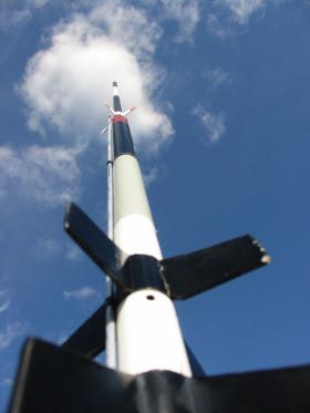 Flight 1) I loaded it “to the max” with a D12-0 and a C6-5 (it was rather windy so I thought a C6-7 wasn't a good idea). I don't suppose either flight hit 2350-feet due to the wind, but they certainly went a long way up for a model. I launched off a standard porta-pad, no problems here.. The first launch left the pad quickly and boosted into the wind, moving quite fast. The second stage lit fine and continued on up. I love the smoke trails you get from multi-stage models, and the Fireflash served up a treat.. However, the booster came in very fast — I was watching the top stage, but saw it briefly, coming in ballistic. It failed to tumble and went into the ground quite hard. The top stage made a nice line of tracking smoke before ejection, and something definitely deployed. The rocket came down fast, however, as the 'chute failed to deploy, getting jammed inside the plastic transition between the BT-50 and BT-5. Despite the weight of the rocket, it suffered only a broken fin (the streamer saved it) which was quickly repaired with CA.