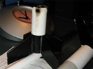 Obviously the booster needs rebuilding, and I think more fins are in order, to hopefully promote a bit of tumbling. Smaller vent holes are also going to be made — 5mm is a little much, and seems to allow too much gas to escape.