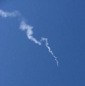 The flight was much like the first flight from the ground — the D12 booster got the rocket going pretty fast, and the top stage definitely lit. I could see that the upper stage smoke trail wasnt even, but seemed to have bits coming out of it (if that makes sense - it was ‘ragged' rather than smooth) and no booster was seen coming in. The rocket coasted to apogee, and deployed both chute and streamer. The RSO said he suspected the booster hadn't separated, and inspection via binoculars as the rocket was descending revealed two sets of fins — not good news.