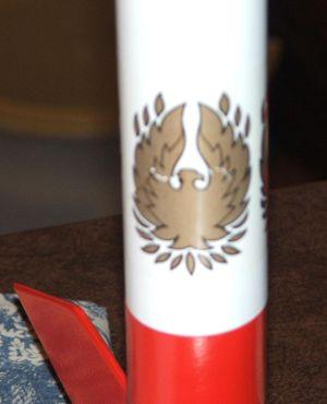 Although a fairly large rocket, the Firehawk was surprisingly simple to finish in large part due to it being built in two separate sections. Once I had securely glued the engine mount into the fincan and plugged all of the potential exhaust leaks, I attached the fins and used thinned Elmer's Fill 'n' Finish to eliminate the tube spirals and balsa grain. This was where not connecting the sections in a rocket like this pays dividends. After priming the whole rocket with Valspar primer, I took an section of scrap BT-60, slipped a tube connector into the fin can, and used the scrap BT-60 as a paint stand. I sprayed the fin section with several coats of Testors Bright Red Gloss, which was an incredibly bad choice. It took five coats and a whole can of the Testors paint to do the small fin section because of the paints inability to cover well. It wound up being a good color choice, but I don't think I'll be buying any more Testors paints in the future. The top section was painted in the same way as the bottom as far as the tube connector and scrap of BT-60, but the Valspar gloss white covered in two coats. When the two sections were dry I glued them together using the tube connector and prepared to apply the decals. I didn't think this would be a problem because I considered the Firehawk a kit of fairly recent vintage. At the time I didn't know that it was produced only in 1989-90, which made the decals fifteen years old at the minimum. This became obvious as they started to come apart as soon as I tried to slide them off of the backing paper. The Firehawk isn't overly laden with decals as there are only three, but it took me over two hours to get them on and looking decent. From a distance the mess isn't evident but please try to be no closer than five feet if you're looking it over.