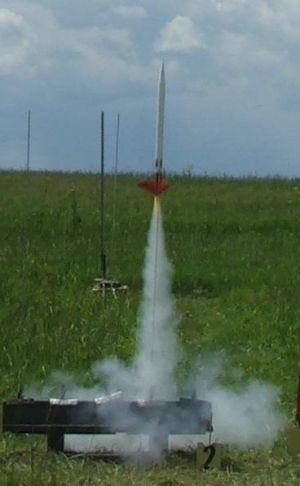 The second flight came two weeks later and was also done on a trio of C6-5s. The flight was as impressive as the first one had been and looked to be quite a bit higher, but the ejection seemed to come quite a bit early. It was after the flight that the real adventure began. The flight had been quite high and the winds came on strong just before the Firehawk was launched. It windcocked somewhat but lacked the fin area for it to be enough when it came to recovery. We watched it as it drifted to the east and out of the park. Having learned from past mistakes, I saddled up the van and drove over to the site but found nothing. I climbed the park fence and followed the path along the area that we had sighted from the pad and still came up empty. I decided to make one more pass along the edge of the subdivision across from the VOA before I gave up but this was turning up nothing as well. I had literally just thought that the search was a lost cause when a lady came out of a house and asked if I was looking for the rocket. I had been within twenty feet of it the whole time but it had nestled into the grass perfectly so that it wasn't visible from any vantage point. It was barely even visible as I stood almost on top of it.