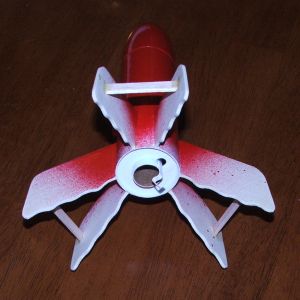 Finishing wasn't all that bad once I figured out the masking. To get the giant tongue effect, it is necessary to mask the rocket after applying the red. However, the contours of the mask need to follow the curve of the "teeth" stickers. I first painted the rocket red using Valspar Cherry Gloss. After the red had cured, I printed off a scan of the stickers on a sheet of regular paper, cut the "teeth" pattern out, and wrapped it around the rocket in the spot where I planned to put the actual sticker when I printed it. I used masking tape to cover everything that needed to remain red, then sprayed the rear of the rocket with Valspar gloss black. I printed the stickers on label paper and after cutting them out, they fit perfectly. Except for the fact that I left off some of the smaller stickers, you'd be hard pressed to tell my faux-Goony from a real one.