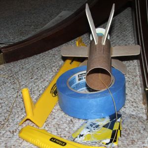 The main body tube from the Baby Bertha could be left as is for this project, if you're not a man who is serious about his Goonies. I chose to keep things proportional and shortened the body tube to the Goony-traditional 5", a feat I accomplished by wrapping a nice, straight line of masking tape around the tube then running a hobby knife along the tape until the blade eventually cut through. If you're planning on using the 18mm motor mount, then this leaves little room in the body tube for recovery equipment. However, the resulting rocket is light enough to employ nose blow recovery. I initially planned to use a small chute and cut away a section of the nose cone so that I could tuck it up inside. This method was a failure, which led to the nose blow experience, but steps could easily be taken to make the chute or streamer deploy more reliably.