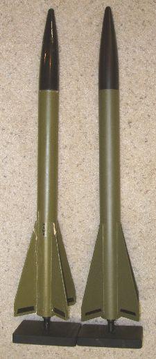 I finished off the rocket with Testors Olive Drab paint for the body and Krylon Black on the nose cone. The black decals on the fins were done with auto pinstriping.