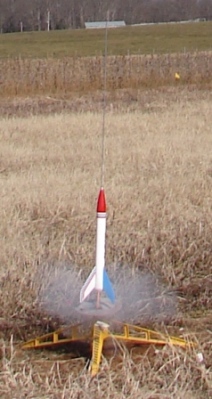 My second flight was on a calmer day, so I used a C6-5. Launch was again dead straight, with ejection right at apogee. I inclined the rod about 10 degrees to better center the rocket on the field (a good choice as I later saw), so it would have ejected prior to apogee had I gone for a straight launch. This model really gets up there on a C engine, easily making the predicted 1000+'. A very impressive show!