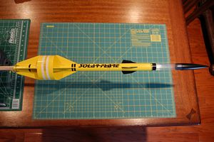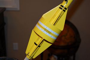 To help with finishing, I applied 3 coats of Aerogloss Balsa sealer before assembly so I had a grain free finish. After assembly I applied one coat of primer and sanded smooth. Then I finished with Krylon Glossy Yellow followed by Glossy Black for the small fins and nose. The decals went on nice and easy, and I really like that Estes went back to waterslide.