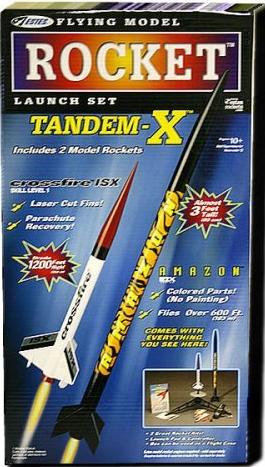 Estes Tandem X Starter Set is an entry level or re-entry into the rocketry hobby consisting of the Amazon and the Crossfire ISX rockets. It is easy to build both of the great fliers and all around fun rockets included. The Amazon consists of: Plastic nosecone Plastic fin-can/motor-mount Plastic coupler with launch lug 2 black body tubes 1 decal Pre-assembled chute ...