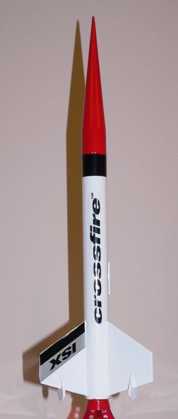 The Crossfire ISX is a Skill Level 1 kit that can easily be built in about a day. This rocket features a totally streamlined shape with aerodynamic fins and nose cone. It stands 15.6 inches (39.6 cm) tall. When launched with powerful Estes standard engines, this bullet can reach cloud busting heights up to 1,200 feet (366 m). A preassembled 12 inch (30 cm) parachute returns the Crossfire back to earth to launch again and again.