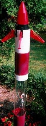 I used about 12 inches of the paper tube to extend the existing booster (the white section just above the silver-colored booster), and made a payload section out of another 7 inches (the red section above that). I made a shoulder using a piece of the telescoping tubing, a home made plywood bulkhead, and an eyebolt.