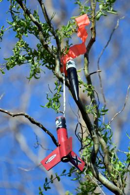 High, fast flight, arcing to the east despite the rod tilt; it drifted back somewhat but managed to end up in the corkscrew willow. After the launch, we got the long branch lopper out and cut off that branch, and the rocket was recovered without damage.