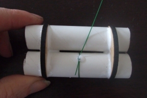 The motor mount which is a cluster ring, is built in its usual way. A steel fishing leader was added to the mount by added one end tied and glued around the engine tubes, with a notch cut into the forward centering ring. The leader stops short of the neck of the body tube, to reduce the chance of the thin steel cable cutting through the body tube at ejection. Fins were attached in the normal way, with the launch lug added to the body tube at the body tube and fin seam. The shock cord is a two foot length of elastic, which was attached to the fishing leader