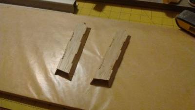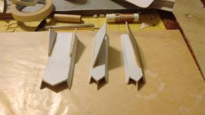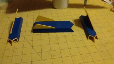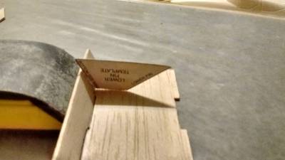 Step 3 of the instructions has you prep and assemble the balsa fins and decorations. Sand the outer surfaces, and use the included angle gauge from the header card to cant the outer box sides to the correct angle.