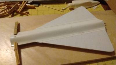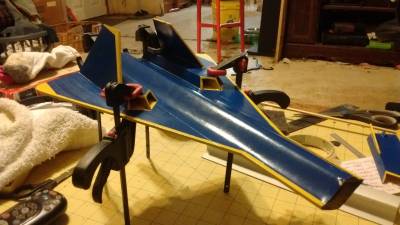 Glue is drying on the lower nacelle. This almost takes 3 hands to accomplish. I ended up tak-ing the sides in place with thin CA followed by gorilla wood glue.