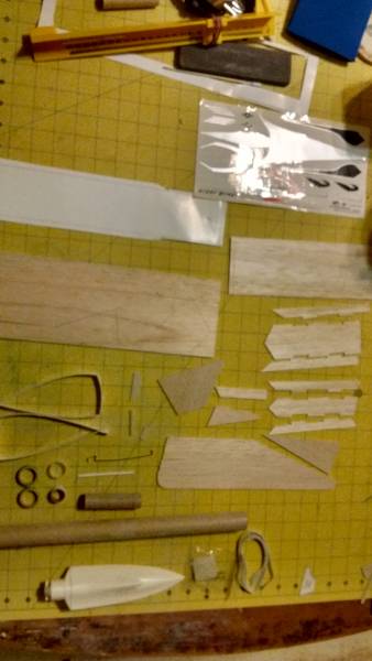 To start with we have our parts layout. This kit pre dates the industry using laser cut fins, so all the fin sheets are die cut. Surprisingly for mine , all of the line from the die cut are very thin. This one must have been an earlier one from the production run while all of the dies were still sharp.