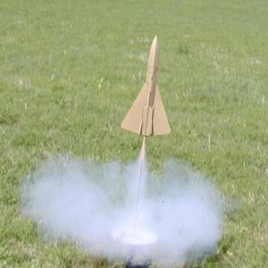 My second flight was on a C6-5. Again a slow lift off but much better and more enjoyable altitude. It seemed to arc over and with the nose cone slightly down, ejected. The parachute didn't unfurl, but the big wings seemed to slow this rocket down on the descent and it landed with no damage.