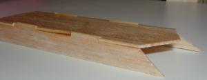 The main wings are three pieces and are assembled by laying them on a piece of wax paper and aligning with a ruler edge. This technique works well. It works better with a second piece of wax paper and placing a book on top to ensure they are perfectly flat. At this point it would be wise to seal and sand the wings (as well as all the balsa parts) considering it can be very difficult to seal and smooth them out once the rocket is fully assembled.