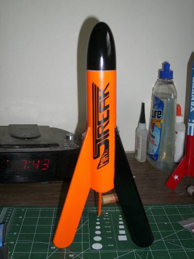 To the the fins, I applied three coats of sanding sealer sanding in between coats. I applied two light coats of primer to the rocket without the nose cone attached. I sanded it smooth then taped of one fin and applied three light coats of gloss orange spray paint.