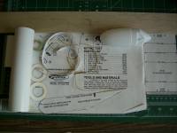 The first step was assembly of the motor mount. The modification I did was to attach the Kevlar thread to the top of the engine hook, cutting a small notch in the top of the adapter ring for thread to fit through and cutting another notch in the adapter ring for the engine hook to lift freely. After the engine mount had dried, I installed it into the main body tube, gluing it into place and tying the shock cord to the Kevlar thread.