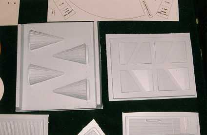 [Parts Pic]The most difficult part of the build, IMO, is building the fins. This consists of cutting the fin halves out of the vacu-form and joining them together. Sounds pretty simple but I strongly suggest taking your time! You are instructed to trim the plastic to approx. 1/16" around the fin, then trim the root edge flush to aid in alignment. The instructions tell you to sand away 1/2 the thickness of the "flange" and then bond together. When dry, you can then sand away the excess plastic. It sounds simple but can be very time consuming. The result, however is worth the time!