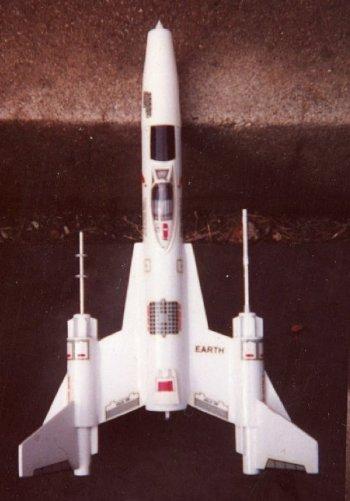 The model is painted solid white, except for the laser cannons that are silver. Trim includes a simulated scoop mounted near the rear, a clear cockpit, cardboard fairings mounted over the structural fin fillets, and a whole bunch of decals. A decal was even provided for the tip of the nosecone to look like turbine blades.