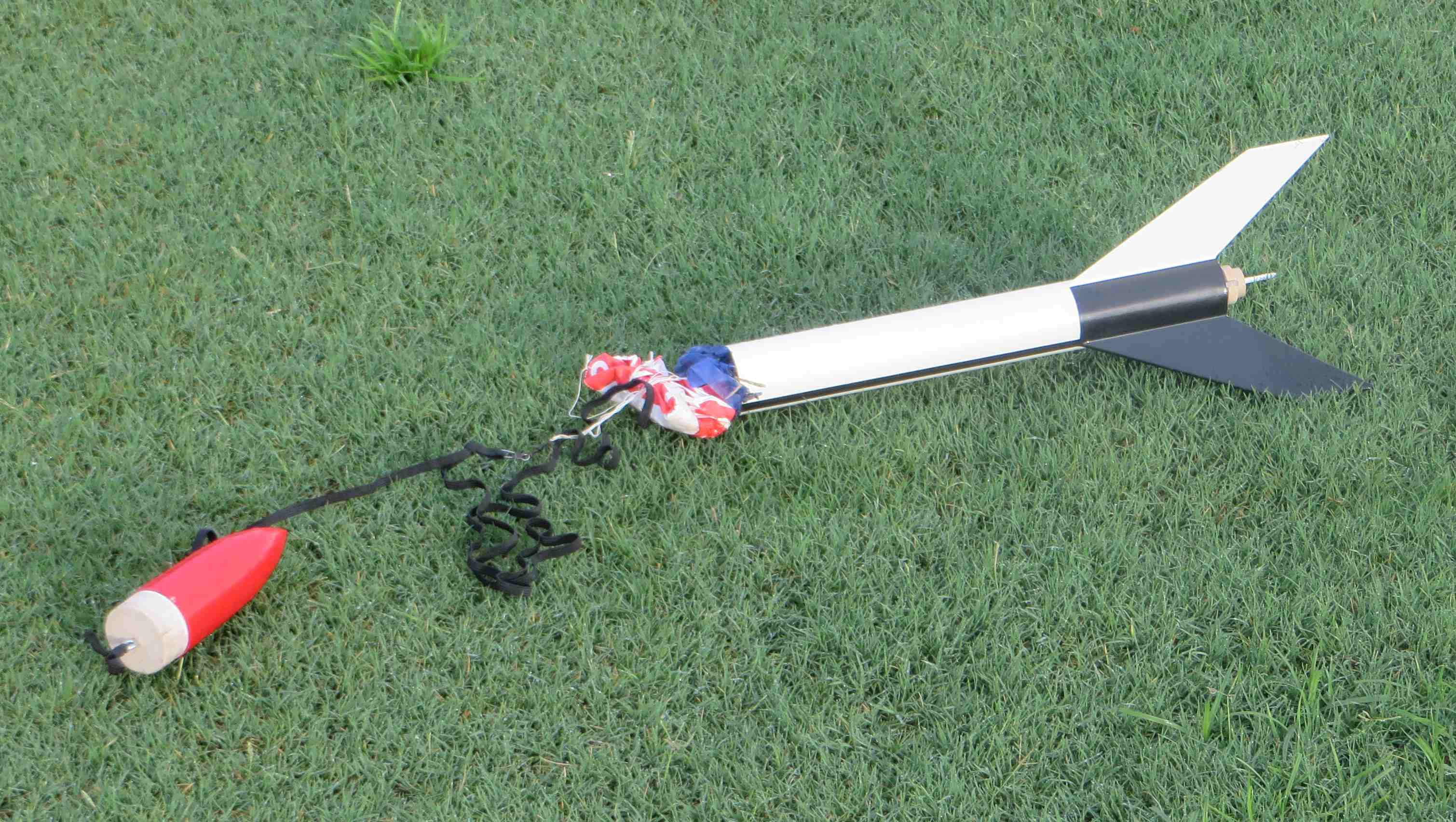 The parachute didn't fully eject and stayed halfway out the top of the body tube. The nose cone did come off and was enough to help the model fall horizontal for a soft landing. No damage.