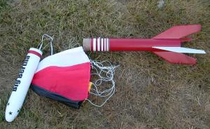 It was flown again at the club launch using an E28-4 reload and a hemispherical nylon ’chute (hand made by my young lovely). A very nice flight indeed, but the shock cord roughed up the edge of the upper section. This was smoothed out, and the inside of the tube coated with thin CA for about an inch or so. That was sanded shortly after it stopped smoking until smooth and until it fit on the coupler smoothly.
