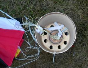 The weight is kind of hefty: 12oz. The original version was about 9oz. The shock cord is arranged such that the ’chute will be pulled out by the shock cord — it’s very near the eye-bolt on the lower end. The cord itself is stuffed into the upper airframe followed by the ’chute to ensure that it gets yanked out.