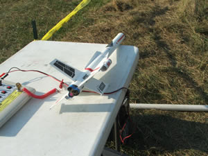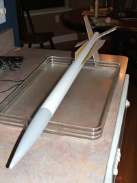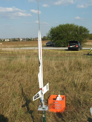 that had been called for in single motor form, I figured that three would work nicely in the cluster. (It also helped that I had previous experience with clustered rockets of this size.) All three motors were wrapped with a 3/4" round of masking tape to make them stick better in the engine tube, then a double wrap went around the extended tubes of the engine mount and the motors. On the only flight to date, only two of the three motors lit, causing the rocket to arch back over the field in an unexpected direction. The arc was gentle enough that it did little more than cause a slight change in the recovery area. No one initially noticed that the flight occurred on 2/3 power, and it wasn't until I neared the recovery area that I noticed the pink plug still in the third motor.