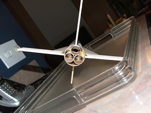 I pulled the Kevlarback through the rear of one motor tube to keep it from getting glue on it, then slid the whole structure into the tube in one smooth motion to keep it from sticking. I left about 1/4" of the end of the motor tubes sticking out (just because I like the way it looks.) I then rotated the tube while looking in from the forward end and let the excess glue fill coat the centering ring and inside of the body tube to guard against any possible spots where the ejection charge could possibly escape. The tube was then stood straight up and allowed to dry.