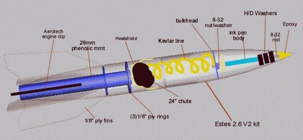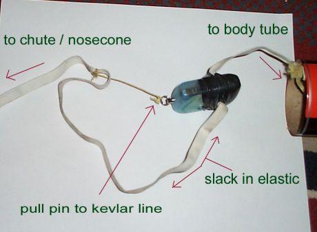 A Kevlarheatshield surrounds the 24" Topflight chute tethered by a Kevlarcord and elastic combo. The chute bay is also strengthened with a layer of thin cya. This puppy will fly well on F and G loads.