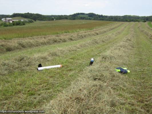 Up, down, a little into the wind and a little back, came down under chute in the recently mown hay field pretty close to the pads. No damage, motor retained. I’m now high power certified!