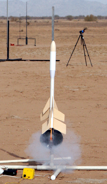 After several squirrely flights off 1/4-inch rod, I replaced the lug with rail buttons. This flight was dang near perfect as she boosted straight up off the 10/10 rail.