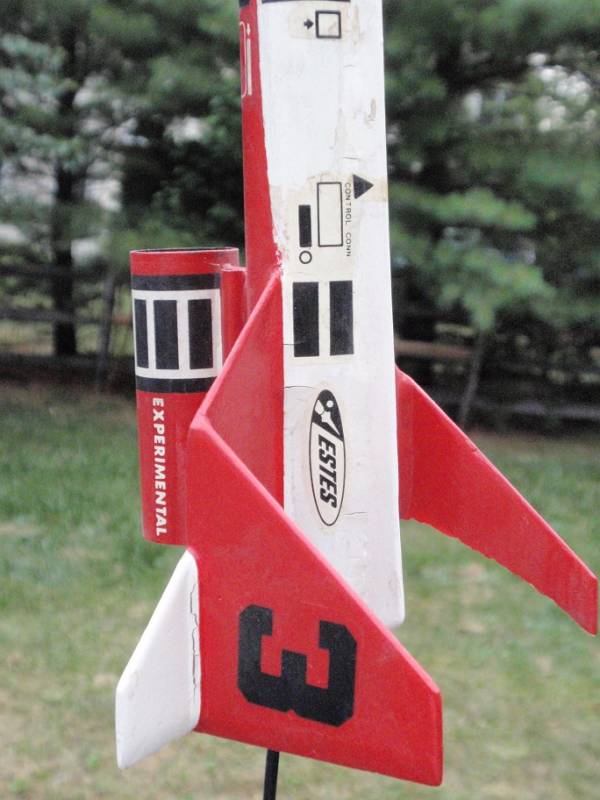 Firecat Tail CloseupNon-flight damage You can better see here the layout of the fin/rudders, and also the missing section on the right. This happened during storage, and not on a flight. I hope to re-construct the right side using the pattern on the left. The original balsa fin is most likely in a landfill, but which one? |