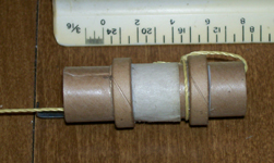 Once that is done, you want to mount the stuffer tube . TEST FIT FIRST! I found I needed to wrap 5 turns of masking tape aroung the middle to get a snug fit before glueing. The next thing you do is sand and fit the nose block. Make sure it fits well enough so theat when you put the cap on it matches with the orientation of the corn.