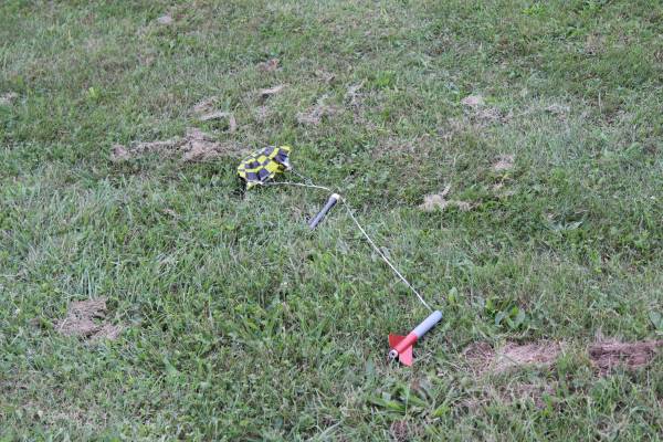 Windcocked slightly out toward the soybeans. Recovered in the grass to the left of the shelter. Transition had a chunk taken out of it at some point.