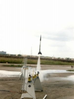 The first flight of this model was at the Gulf Coast Regional Meet at JSC on 10/24/04. Using the Estes E9-4, it got a really nice boost despite the windy conditions. A slight weathercock after burnout had the model's ejection charge going off as it was facing into the wind, and the plastic drag chute's shroud lines mostly ripped off from the tape strips and the thin shock cord produced an ugly zipper about 1 1/2 inches from the top of the body tube. The zipper wasn't that bad, so I was able to repair it.