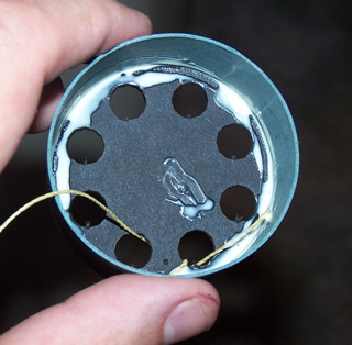 After fumbling for a while, I gave up on trying to pass the Kevlar® through the provided hole. This was a reflection of my fraying Kevlar® and more importantly, my fraying patience. Instead, I tied a loop around one of the sides of a hole. The Kevlar® was then fitted into a side notch and the disk test fitted into the coupler. It fit perfectly. I glued it in place with yellow glue and smeared some extra over the lower surface of the baffle to act as an ablative surface. I filleted both sides and let it dry.