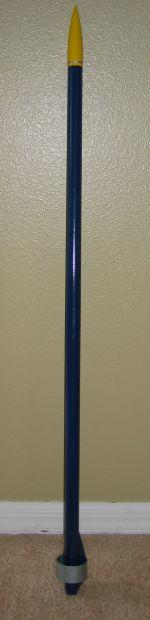I began the finishing process by applying diluted Elmer's Fill 'n' Finish to the fins and balsa nose cone and then sanding them down until smooth with 320 grit sandpaper. The entire rocket was given a couple coats of Krylon white primer and were sanded with 400 grit sandpaper after each coat. The nose cone was painted Krylon Sun Yellow Gloss separately while the rest of the rocket was painted Krylon Regal Blue Gloss.