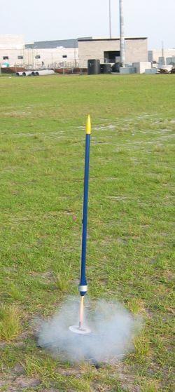 On the first flight, I think I may have packed the Estes wadding a little too far down the body tube as the nose cone separated at ejection but the shock cord and chute didn't fully come out of the rocket. It drag recovered landing on a pile of dirt. This put a slight kink in the body tube just forward of the fins. There was more damage to my pride than the cosmetics of the rocket.