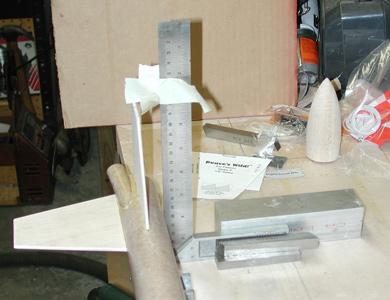 I wanted the fins to be exactly straight and 90 degrees. In order to set this up I used a 90 degree carpenter's square. I taped the rocket body down to a flat table top, then stood the square against the end where it could almost contact the fin. I used a piece of 3 X 5" index card taped to the fin to hold the fin exactly parallel to the square. The card was then clamped to the square with a clothes pin until the glue was dry. The next fin was put on 180 degrees to the first one, using the table edge as a "stop". The square was brought up as close as possible and that fin was held in place the same way until the glue was dry. And so on with the other two fins.