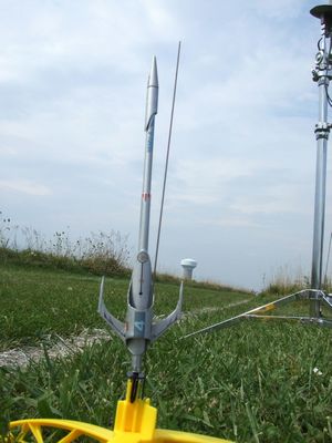 I dropped the HEMV-4 onto a standard Quest launch pad (for MMXs), hooked up my 12V leads, and fired away. It lit on first attempt and had a nice gentle flight to about 60-80 feet apogee. Most micros zip up so fast they're difficult to track, but this one was slow enough to follow the whole way.