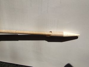 The nose cone is attached to the shock cord via a little brad, however, I personally prefer to just use the brad to make the hole, which I then fill with glue, and then use the brad to poke a knotted end of cord into. The glue tends to grab the cord a lot better than a metal nail.