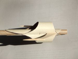 A BT-2.5 tube serves as the motor tube and main body tube. There are a pair of BT-20s that get scalloped (tapered) on each end and slotted. The two BT-20s then slide together through the slots, and the assembly slides over the BT-2.5. This process is one of those phases where it's critical to pay attention to the illustrations and instructions. On my kit, the BT-20s were too short, but I understand this is being corrected.