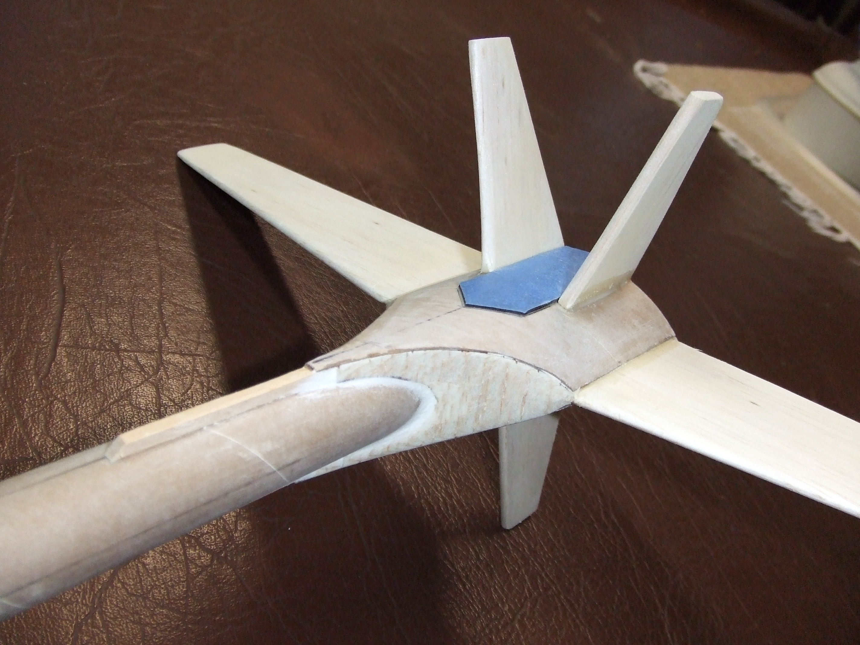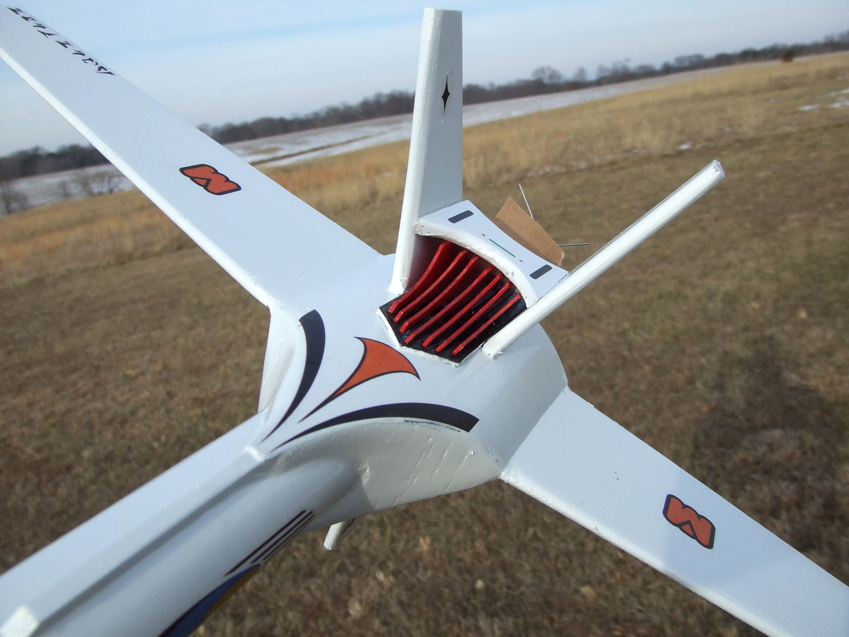 With the BT70 covers and balsa plates in place, construction moves to the intake assembly, a sort of ramjet style section comprised of a fiber base plate, 7 fins, and a balsa tap cover. Since I intended to use contrasting paint colors, I paused at this point to get some base painting done. I painted the fiber base plate offline a gloss black, attached it to the model, then masked it off. Next, I tacked on the two vertical stabilizer fins that but up against this plate and a rudder that sets on the opposite side with a launch lug. I took care of spirals, grain and seams, then hit the rest of the model with a gray primer, then a couple coats of white. Next, I painted the fiber radiator fins offline a gloss red, tacked them onto the (unmasked) base plate. I then cut the balsa top plate, painted it gloss white, and tacked it into place above the radiator fins. Good luck with that scheme trying to paint it after everything's built...